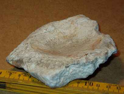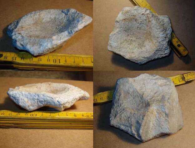 Frische Bruchstellen sind das aber nach meinem Eindruck nicht, auch wenn das auf dem Bild so aussieht. Die Ursache für die helle Färbung am Rand hielt ich bisher für Ausblühungen löslicher Mineralien (Kalk?) Die Mulde ist in der Tat ziemlich regelmäßig gerundet und genau dadurch ist mir der Stein ja auch aufgefallen. Durch die Kerbe (im Bild rechts oben) erinnerte mich das Ding spontan sehr an einen rustikalen Aschenbecher bzw. ... etwas wahrscheinlicher: für ein Schälchen - vielleicht um darin etwas zu mahlen. Der Boden der Vertiefung ist allerdings nicht so glatt, wie ich es bei einer Reibschale erwartet hätte ... ??? |